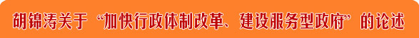 加快行政管理體制改革,建設服務(wù)型政府。行政管理體制改革是深化改革的重要環(huán)節。 要抓緊制定行政管理體制改革總體方案,著(zhù)力轉變職能、理順關(guān)系、優(yōu)化結構、提高效能, 形成權責一致、分工合理、決策科學(xué)、執行順暢、監督有力的行政管理體制。健全政府職 責體系,完善公共服務(wù)體系,推行電子政務(wù),強化社會(huì )管理和公共服務(wù)。加快推進(jìn)政企分 開(kāi)、政資分開(kāi)、政事分開(kāi)、政府與市場(chǎng)中介組織分開(kāi),規范行政行為,加強行政執法部門(mén) 建設,減少和規范行政審批,減少政府對微觀(guān)經(jīng)濟運行的干預。規范垂直管理部門(mén)和地方 政府的關(guān)系。